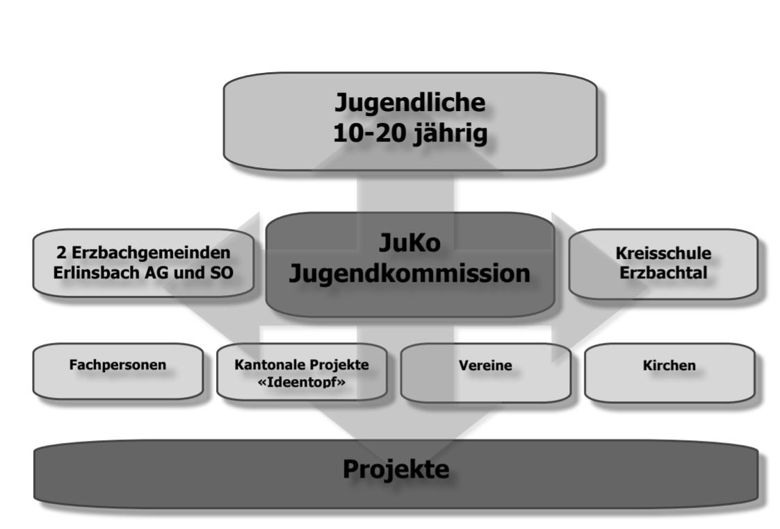 Das Organigramm zeigt die Zusammenarbeit der JuKo mit Jugendlichen, Schulen, Gemeinden, Vereinen und Fachpersonen. Gemeinsam werden Projekte entwickelt, die Jugendliche zwischen 10 und 20 Jahren fördern und die Gemeinschaft stärken.