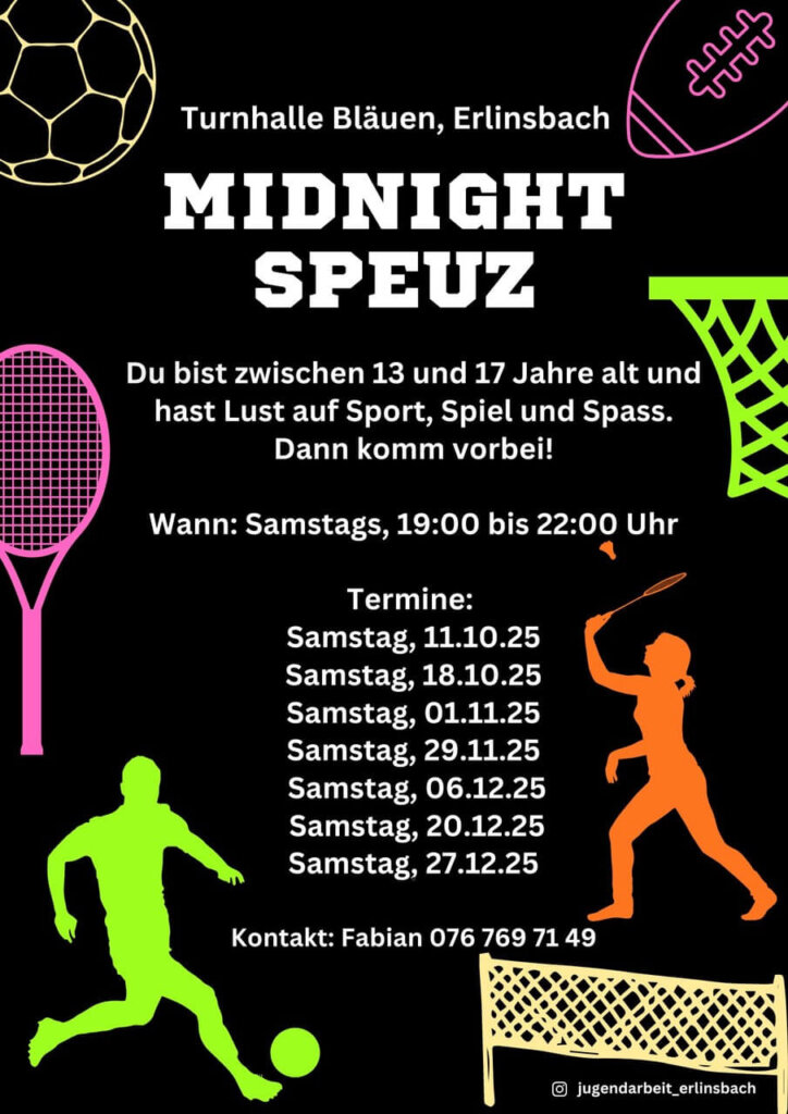 Am Samstagabend öffnet die Turnhalle Bläuen in Erlinsbach AG ihre Türen für Jugendliche der Oberstufe bis 17 Jahren. Von 19:00 bis 22:00 Uhr bietet „Midnight Speuz“ einen kostenlosen Treffpunkt, an dem sich die Jugendlichen in einer sicheren und betreuten Umgebung sportlich betätigen, neue Freundschaften knüpfen und einfach Spass haben können.